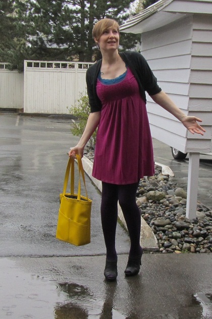 It’s a bit too low-cut for work, so I layered it over a turquoise tank top. Sometimes I can’t get away with empire-waist dresses, but this one seemed okay. It lies flat on the stomach and I don’t (I hope) look pregnant (not that there’s anything wrong with that—unless, of course, you’re not prego). The purple tights were close to the shade of my shoes (black), but added a bit of color. The bag made up for the brightness of the missing sun.