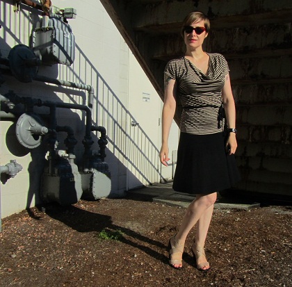 I also realized that I’m wearing the same color palette as I did a couple of weeks ago when I wore my tiger-striped top. I have on the same skirt, the same colors in my top, a watch instead of a cuff, and the same style shoes (in a different color). Funny.