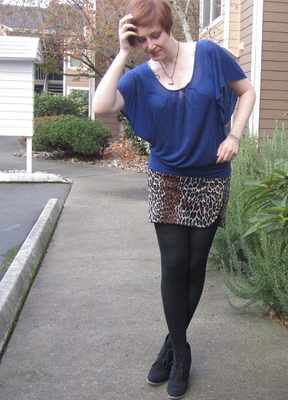 Later, I paired it with a billowy top in blue. Blue is unexpected and doesn’t vamp up the look. The tights are opaque and the heels are chunky.