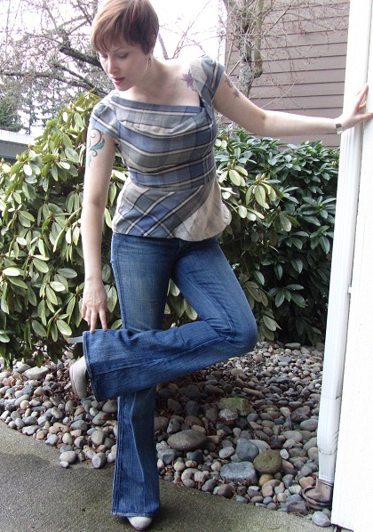I hit the jackpot at a clothing exchange I went to a few months ago. One of the pieces I picked up was this neat, asymmetrical plaid top. I thought it would look great with denim so I wore it with a pair of jeans I got at another clothing exchange last year.