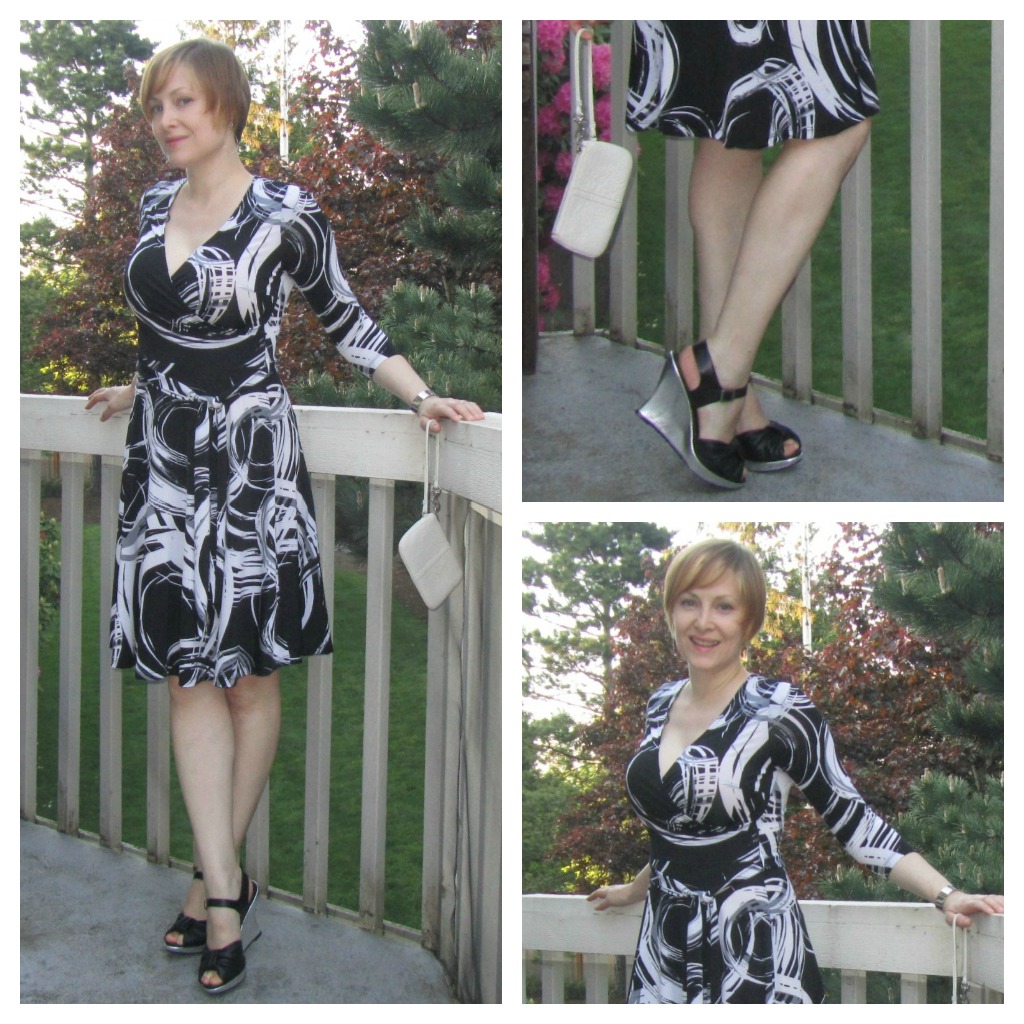 I snagged this graphic dress for $5 at Goodwill a few weeks ago. It’s a Forever 21 number, so it’s worth about $25. If it were a designer number, it would be ten times that. But I liked it and it fit. Two important criterion. I featured this dress in my post on Be In Style. If you haven’t read it, have a look and learn about how I find good, thrifted items.