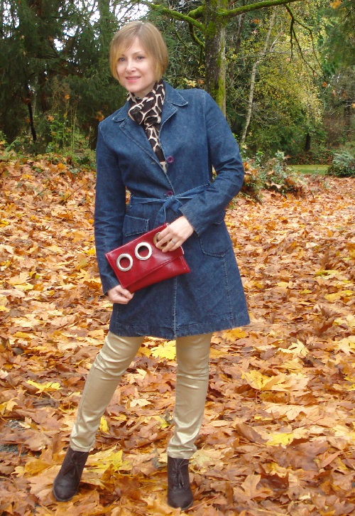 I paired them with a cranberry top and brown faux-suede booties. The giraffe-print scarf is a favorite of mine and doesn’t get a lot of exposure, so I wore it too–especially since I had plenty of textures but no patterns in this outfit.