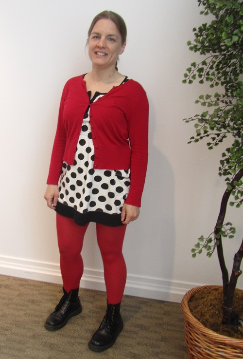 When Londoner Kip told her friends she’s had her photo taken for a style blog, they laughed. Kip runs The Messy Vegetarian Cook blog and is known for her recipes, not her outfits. But who’s laughing now? From the red tights and adorable polka-dots to the cute cardi, this is a great look. I think I need a pair of 8-hole vegan Dr. Martens now too!