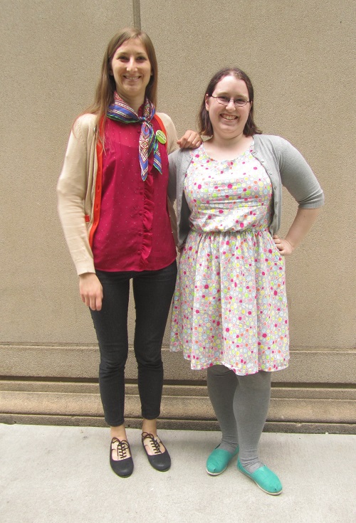 Helen and Molly are also from Seattle. They are the voices behind Vegtastic and Vegan Princess in an Omni Kingdom, respectively. I paired them up for my impromptu shoot because they both had on dots. Helen’s top has a subtle Swiss dot and Molly’s dress is a whimsical circle print. I like how they show how to layer with cardigans and how to rock flats. I think Helen might be wearing Cri de Coeur (and Jesse, above, might have on the same style. Great minds…).