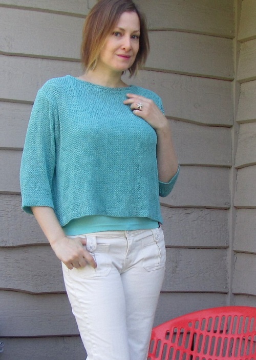 White jeans for Jean White!! Great paired with robin’s egg blue. Love the crop-style top worn over a tank top.
