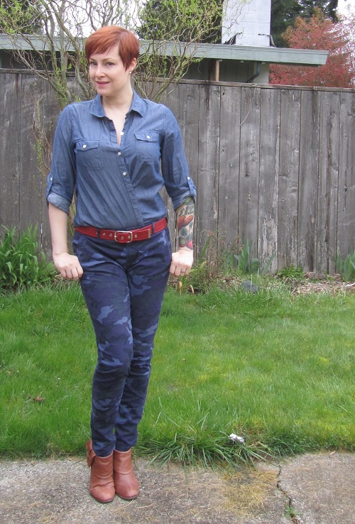 Love the camo pants, they pair perfect with the chambray shirt and red belt. I think you’re lucky you have shoes that match your hair colour.