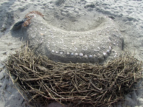 This sand chicken is sitting on her nest of sticks and twigs found on the beach. Her beak, comb/wattle, and feathers are color-coordinated shells from the beach. Love the mixed media in this sculpture!