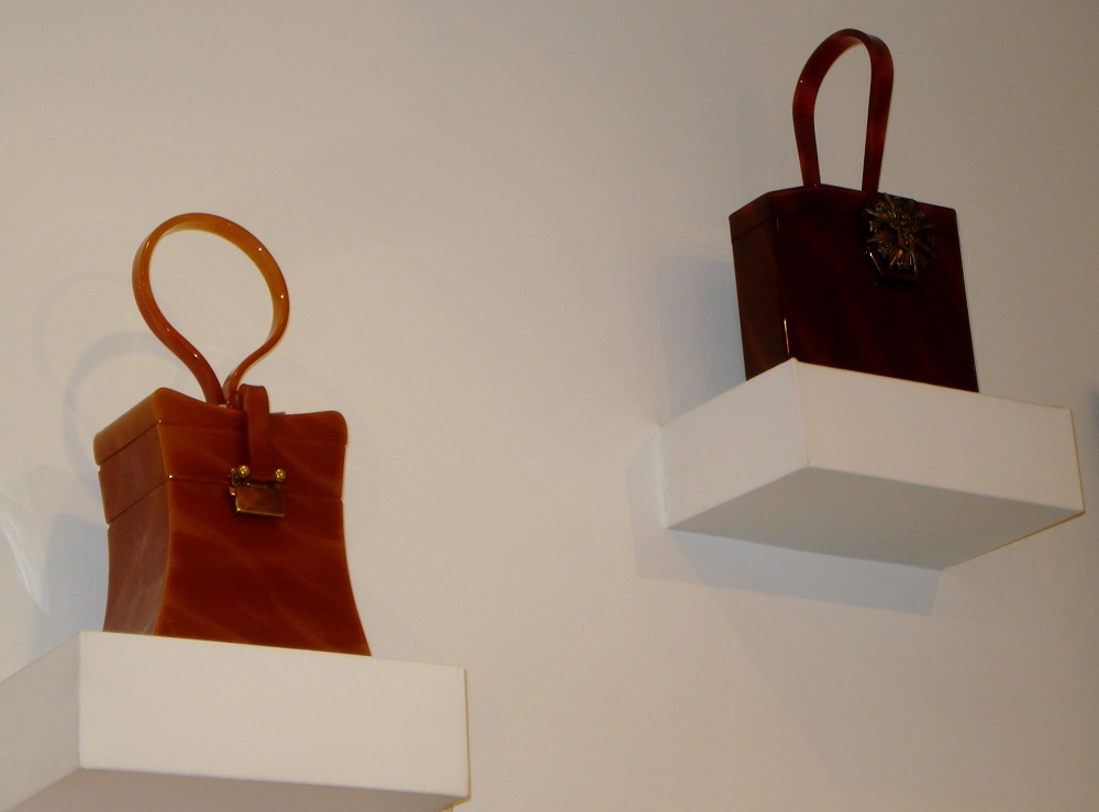 The boxy nature of the handbags made adding secret compartments an option. This one came with its own lipstick and powder!
