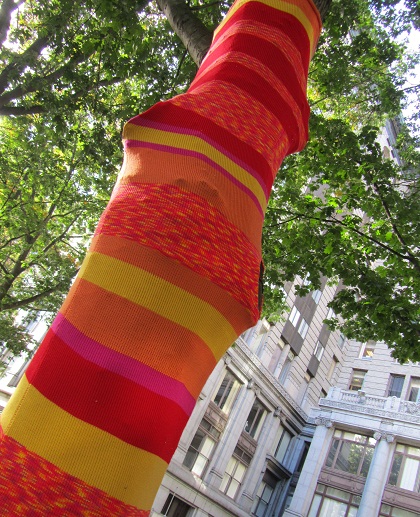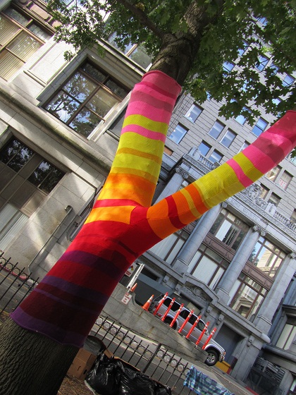 Autumn and I said goodbye to Amy and then we wandered to Occidental Square, where we found more yarn bombing! This is the same set of work that I wrote about a couple of months ago. This time, I found out who the artist is: Suzanne Tidwell created it.