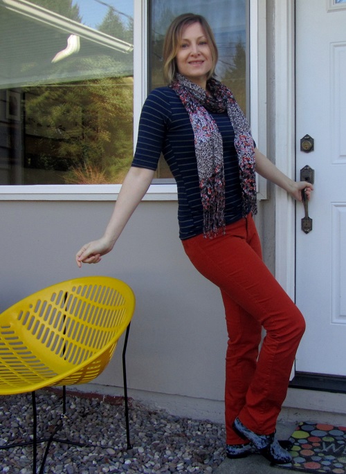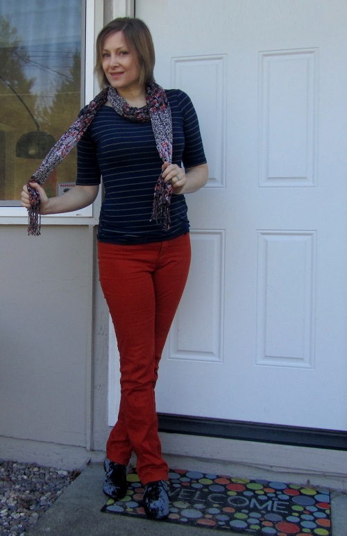 I wore the top with denim capri pants (also slightly retro). Capris are a great seasonal transition piece. My red sandals got one last hurrah. I’ll be switching to closed-toed shoes soon. The rains are coming.
