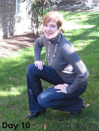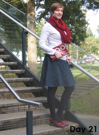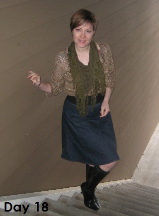 Day 18: TGIF! I don’t say that often, but after staying up late to go dancing last night and attending a plethora of meetings today, I’m glad it’s Friday. I wore denim (casual Friday, and all – even though I don’t have a dress code at work), but I fancied it up by choosing a denim skirt and adding gold accents. I tucked in the sweater to make this look more dress-like. I would normally have worn this with brown boots and a brown belt, but since I didn’t have those in my 30 items, I opted for black. I think it works.
