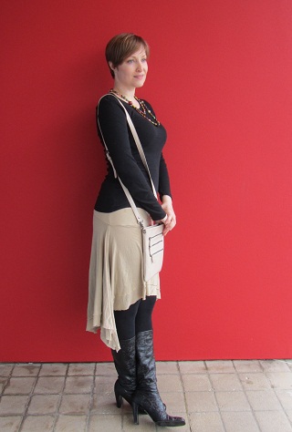 This outfit was a test to see if I could use a skirt that I picked up at a clothing exchange. It’s an odd color (or lack thereof) and I thought wearing it bare-legged might see like I was not wearing anything! So I added tights and boots in a contrasting color.
