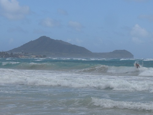 It’s a five-hour flight to Honolulu, and that gave us the afternoon to wander through Waikiki, the busy, touristy part of the city. I was thrilled when The Pacific Beach Hotel upgraded us to an ocean-view room. Those little dots in the water are surfers waiting to catch a wave. The water seemed calm but every now and then, they’d ride a wave to the shore.