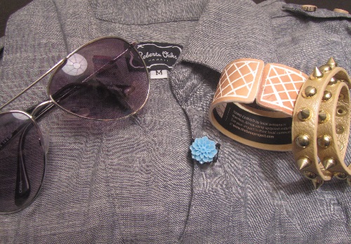 I bought a chambray dress from her, as well as a upcycled cuff made in Namibia of old PVC pipe. It’s hand-carved and looks like bone or horn–but it’s vegan and sustainable! The fair-trade company, The Base Project, enables artisans to hone their crafts, helps their communities, and earns them money for education, healthcare, and food. Hubby bought aviators, and I also got a leather-look rubber wrap bracelet, a ring made by a friend of Roberta.