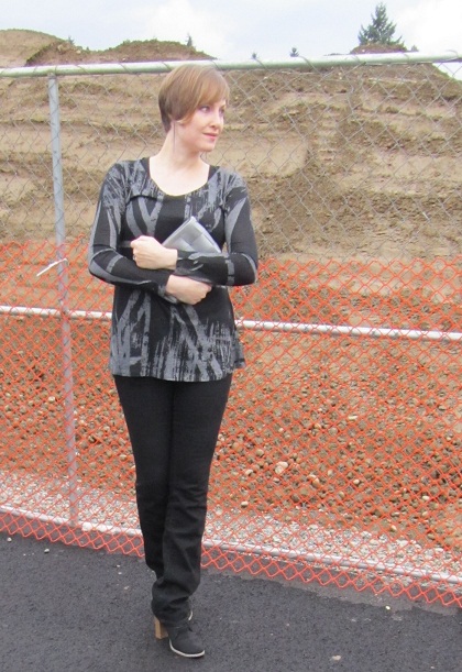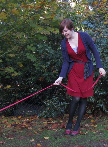 Fresh on the heels of mixing black and brown, I thought I’d try another unlikely color combination: Red and purple. I purposely chose a blueish-purple cardigan with a deep red dress. Tomato red and violet would work, but would be especially bold and bright. Baby steps!