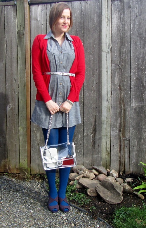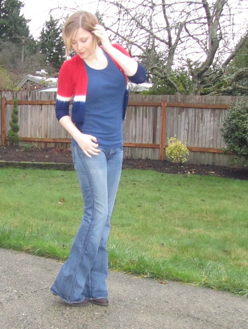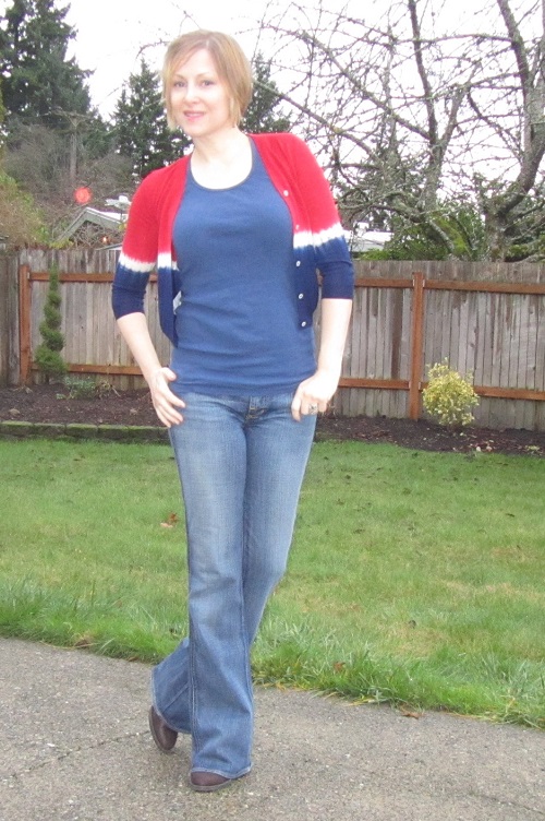 Some items in my closet have staying power. This Missoni for Target shirt is one such item. I’ve worn this with tights and booties and I’ve worn it with skinny jeans and boots. This time, I’ve chosen denim leggings (yeah, yeah–jeggings) and nude ballet flats.