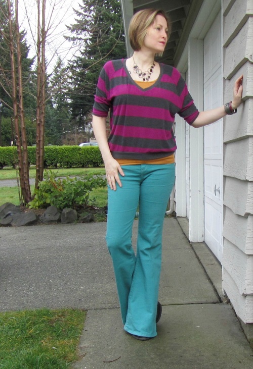 This skirt is a terrific idea. Betabrand needed a way to use up the ends of colorful fabric. Their screen printer used to test ink on t-shirts but was asked to use the roll ends instead. Each panel is printed with ink “tests.” It’s a mashup of colors and patterns and I adore it! I can wear this with any panel on the front, and I can fold the waist over if I want a shorter look.