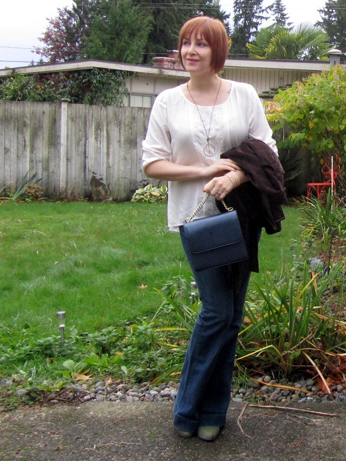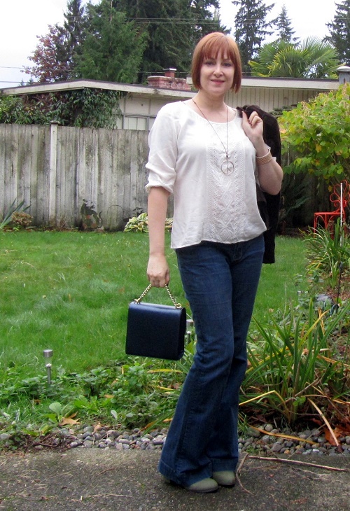 Jeans seemed like a safe bet. When I added my blouse, with its tone on tone embroidery, I felt slightly bohemian. So I embraced that boho feeling and added a peace sign necklace and PVC pipe cuff with a tribal vibe.