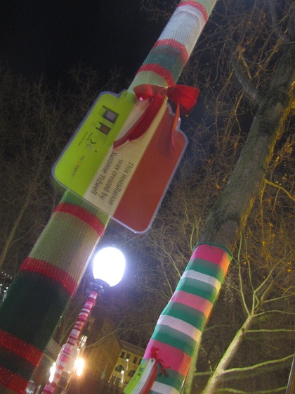 Autumn and I said goodbye to Amy and then we wandered to Occidental Square, where we found more yarn bombing! This is the same set of work that I wrote about a couple of months ago. This time, I found out who the artist is: Suzanne Tidwell created it.