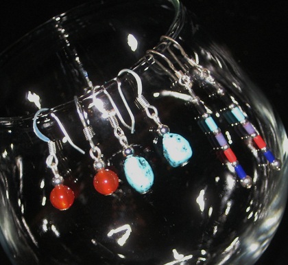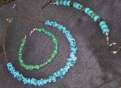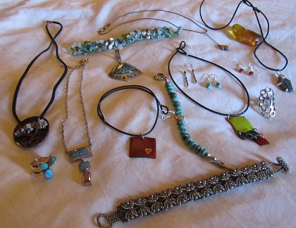 In my rush to get authentic Southwest jewelry while I could, I snapped up a few pieces of Native American jewelry from another artist. His prices were terrific too, and all the pieces are made by him. I bought a bracelet, two necklaces, and three pair of earrings. Their style was similar to a bracelet (also in the following picture, in the upper-right corner) I bought earlier at the Farmers’ Market.