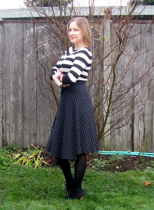 Okay, up to the skirt. This skirt looks red, but is actually a fine red and black striped fabric. I saw it on clearance and couldn’t resist (even though I’m trying to stick to my shopping goals of supporting USA-made and/or small businesses–it’s hard to break old habits and shop in a new way!).