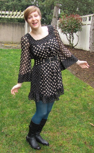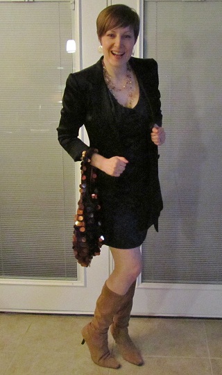 Back to the belt. I chose a plain black elastic belt. I removed the leggings and tried a bare-legged look with faux-suede boots. I’d wear this to dinner or dancing. For me, bare legs and a short shirt wouldn’t work at work.